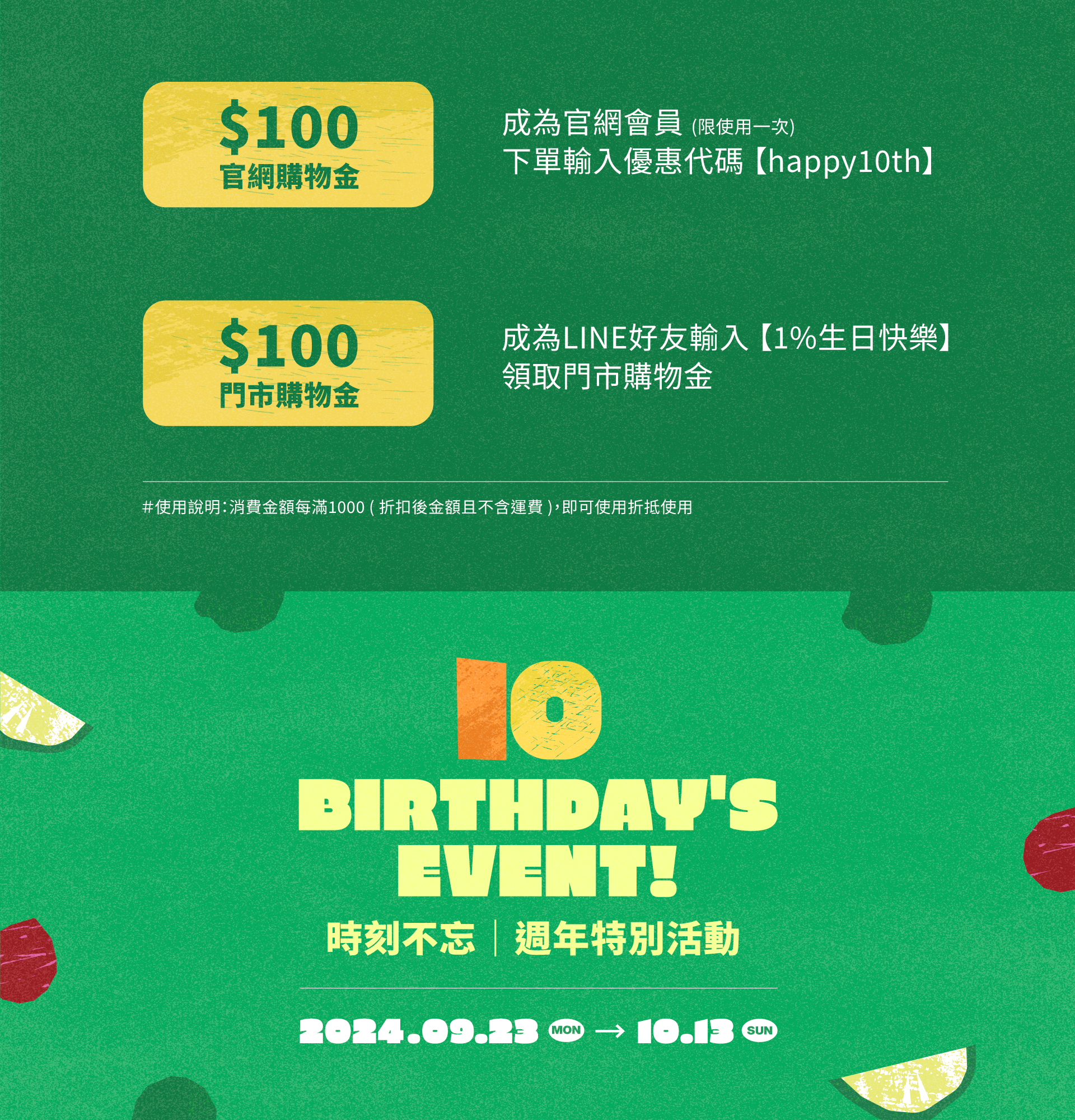 ⛧成為官網會員下單時輸入優惠代碼『 happy10th 』