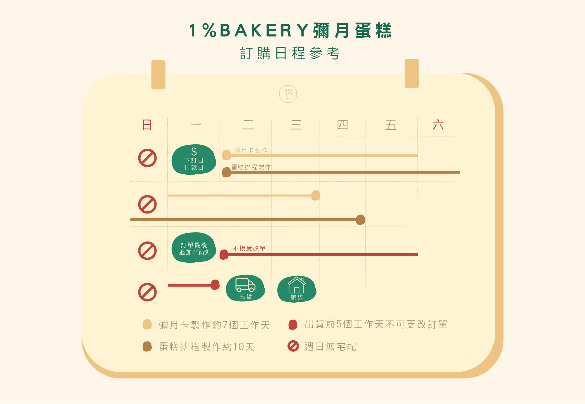 A:蛋糕都是接單付款後安排製作,建議約兩個禮拜前下訂,比較可以在您想要的日期收到蛋糕。