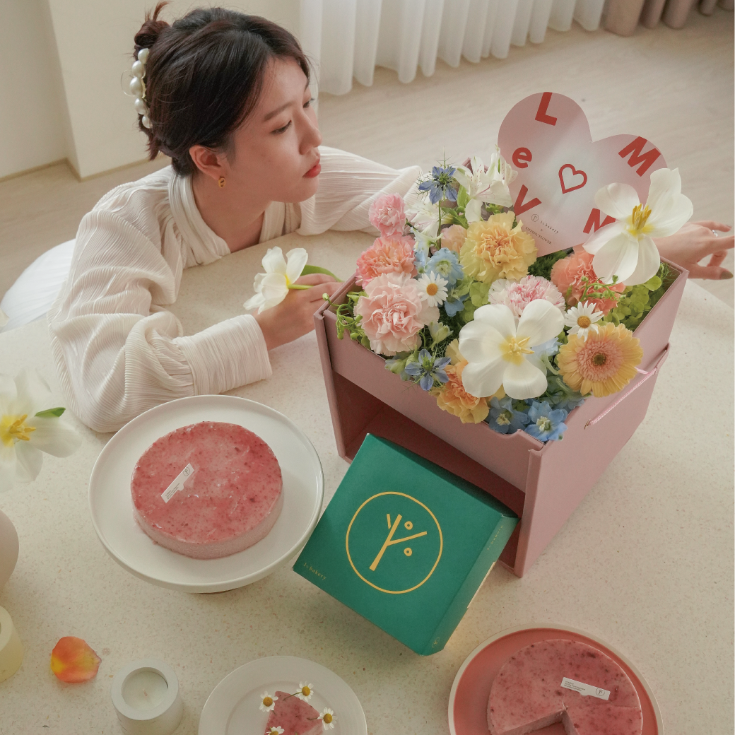 玫瑰荔枝重乳酪蛋糕 + 時髦俏皮花禮盒