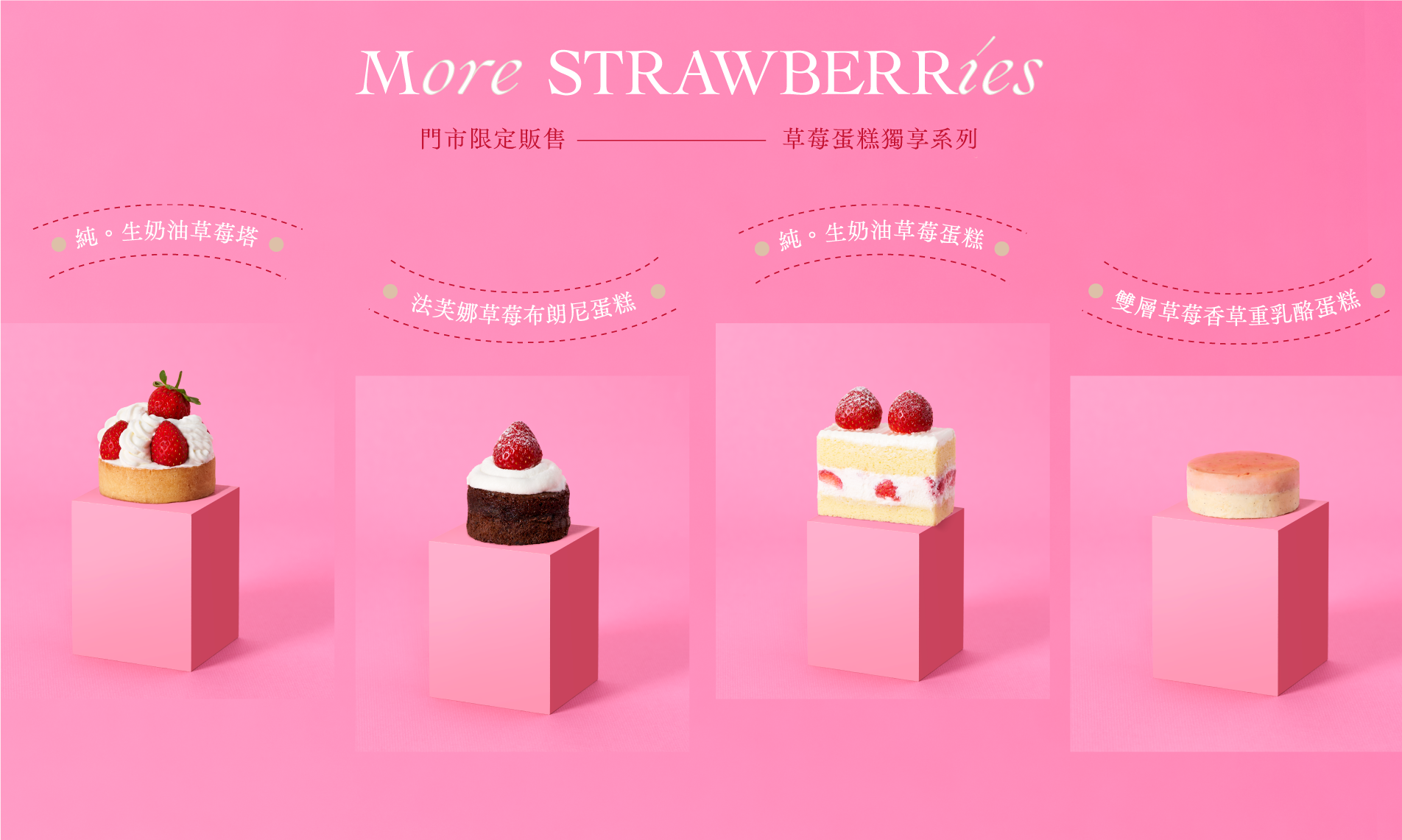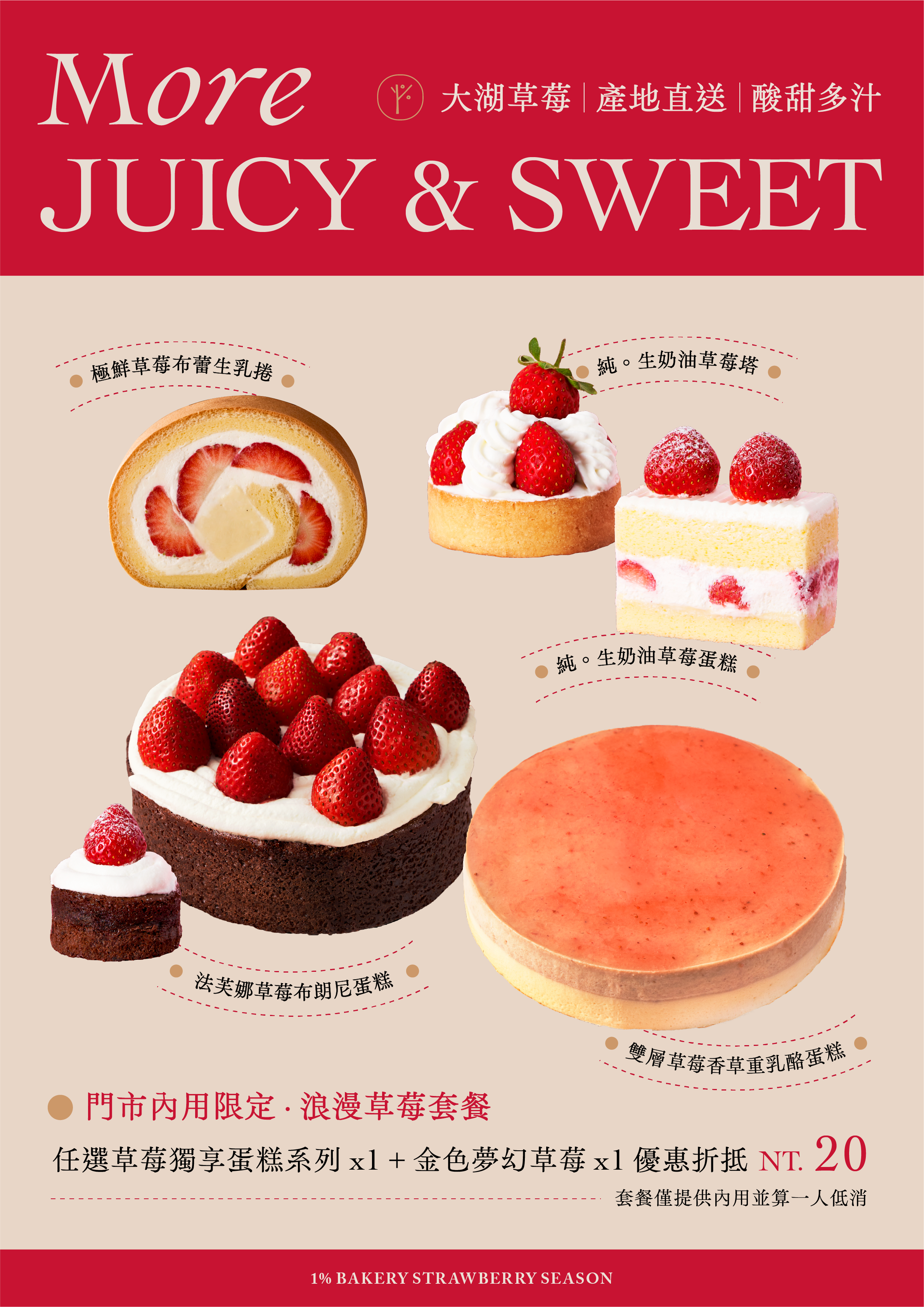 .「草莓套餐」任選草莓蛋糕獨享系列乙個 + 金色夢幻草莓乙杯,優惠折抵NT.20 ( 套餐僅提供門市內用與一人低銷 )