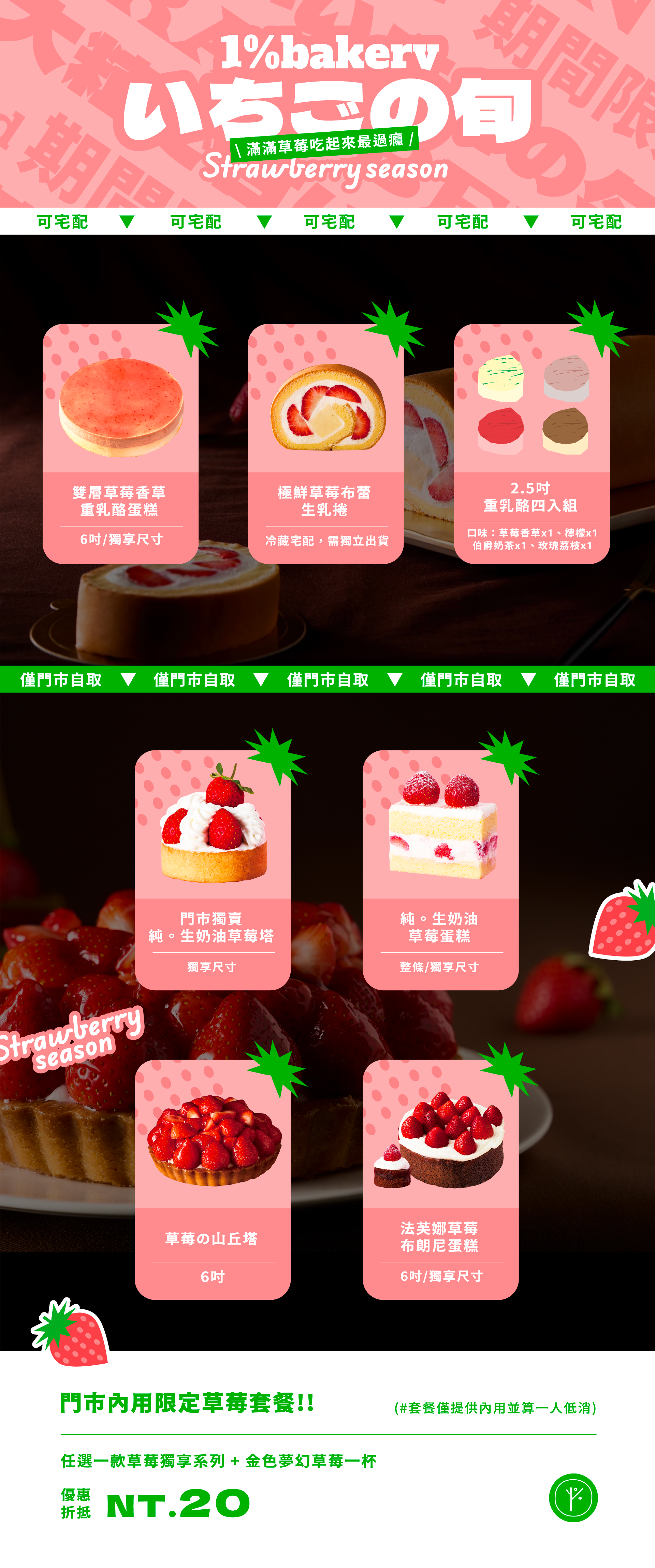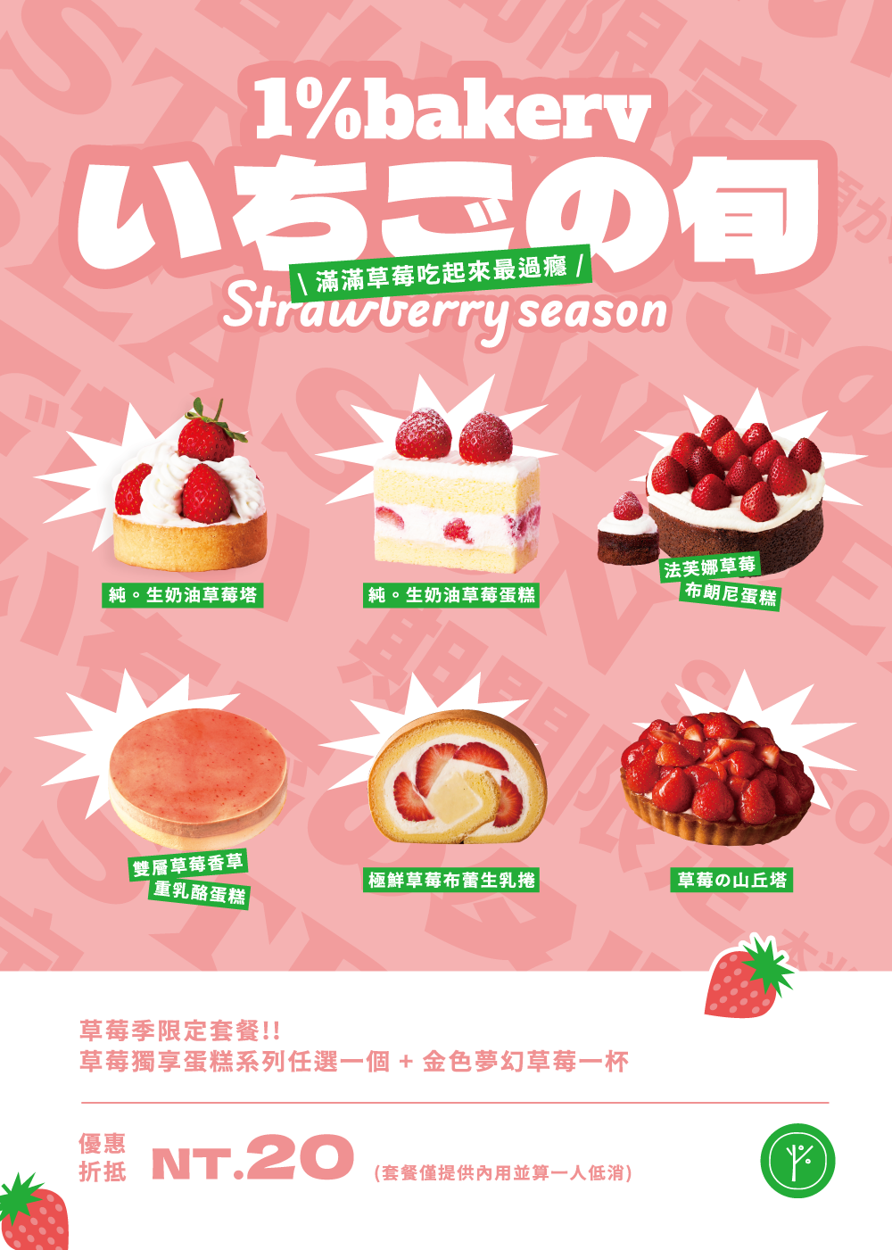 .「草莓套餐」任選草莓蛋糕獨享系列乙個 + 金色夢幻草莓乙杯,優惠折抵NT.20 ( 套餐僅提供內用與一人低銷 )